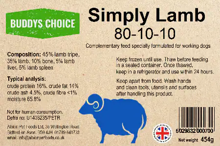 Buddy’s Choice Purely Lamb is a high-quality, single-protein raw food specially formulated for working dogs. Made with 45% lamb tripe, 35% lamb, and 10% bone, this complementary feed is perfect for maintaining muscle mass, supporting joint health, and promoting overall vitality. With no artificial additives, preservatives, or fillers, this raw food is an excellent choice for those seeking a clean diet.