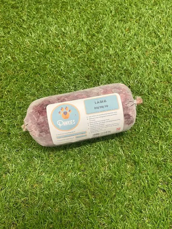 Pawkies Lamb 80-10-10 is a single protein raw dog food made from locally sourced lamb, minced through an 8mm plate. This prey model 80-10-10 meal is built around roughly 80% lamb meat, 10% soft lamb bone and 10% offal (at least 5% liver and 5% other secreting organ). No grains, no fillers. Supplied as an individual frozen 454g chub.