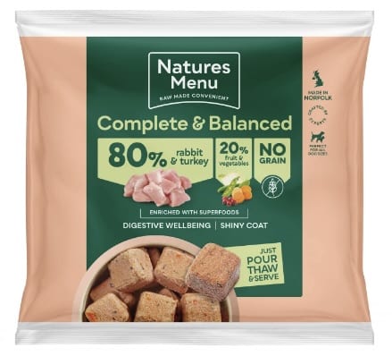 These raw rabbit and turkey dog food nuggets are a great way to introduce a novel protein, with the full, appetising flavour of rabbit. As with all our complete and balanced meals, you can feed this raw rabbit and turkey dog food with the peace of mind that comes with choosing a food that’s crafted by our experts and made to FEDIAF guidelines. Our Natures Menu 80/20 dog food rabbit and turkey nuggets are complete and balanced and made with the highest quality, natural ingredients you can see and understand.